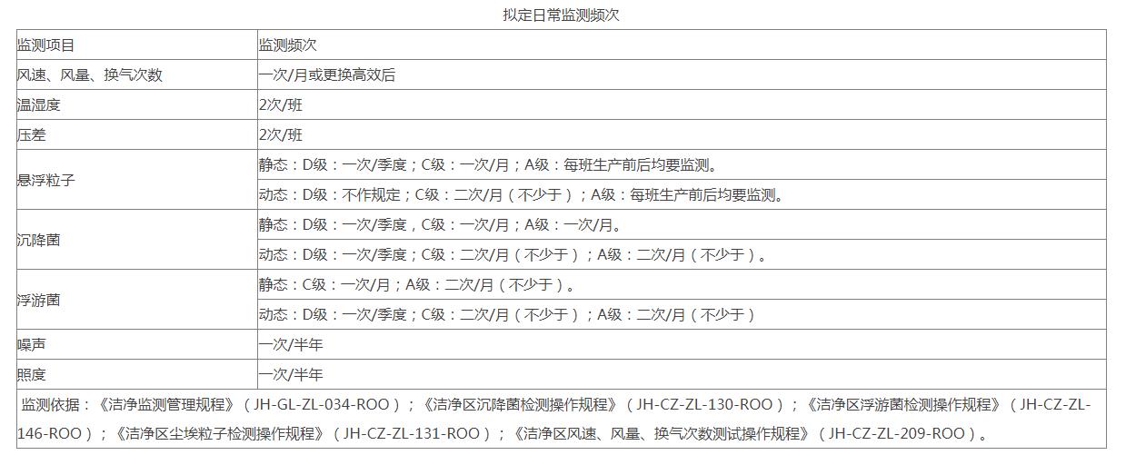 監(jiān)測依據(jù):《潔凈監(jiān)測管理規(guī)程》(JH-GL-ZL-034-ROO);《潔凈區(qū)沉降菌檢測操作規(guī)程》(JH-CZ-ZL-130-ROO);《潔凈區(qū)浮游菌檢測操作規(guī)程》(JH-CZ-ZL-146-ROO);《潔凈區(qū)塵埃粒子檢測操作規(guī)程》(JH-CZ-ZL-131-ROO);《潔凈區(qū)風(fēng)速、風(fēng)量、換氣次數(shù)測試操作規(guī)程》(JH-CZ-ZL-209-ROO)。